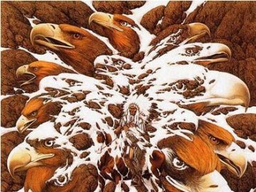 恶搞图片一个印第安酋长骑一匹马,周围全是鹰的脑袋